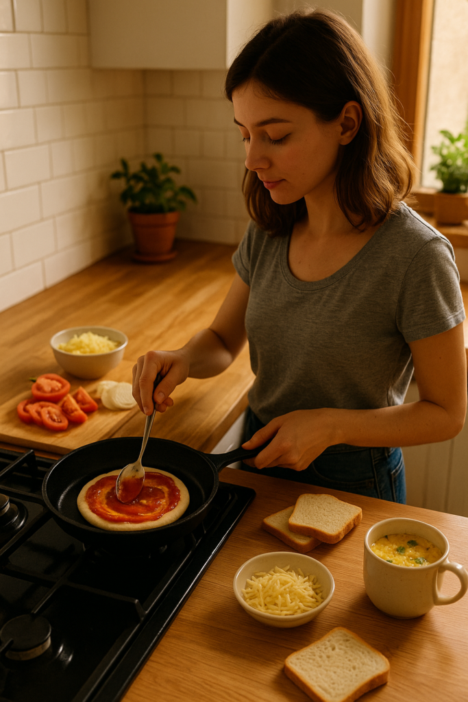 - Cozimento final: Ligue o fogo novamente, ainda baixo. Tampe a frigideira para criar um efeito de forno e aqueça por mais uns 3 a 5 minutos, até o queijo derreter bem e as bordas da massa ficarem crocantes. Fique de olho para não queimar a base – fogo baixo é o segredo.